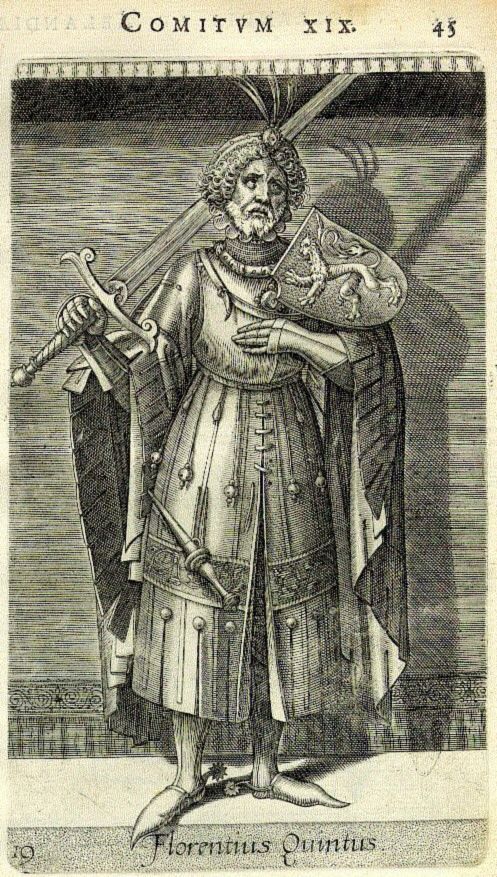 Portret van Floris V (juli 1254 - 27 juni 1296), bijgenaamd 'der keerlen god' ('god van de gewone mannen'). Door Michiel Vosmeer (1578). Uit: Principes Hollandiae et Zelandiae, Domini Frisiae. Cum genuinis ipsorum iconibus. |