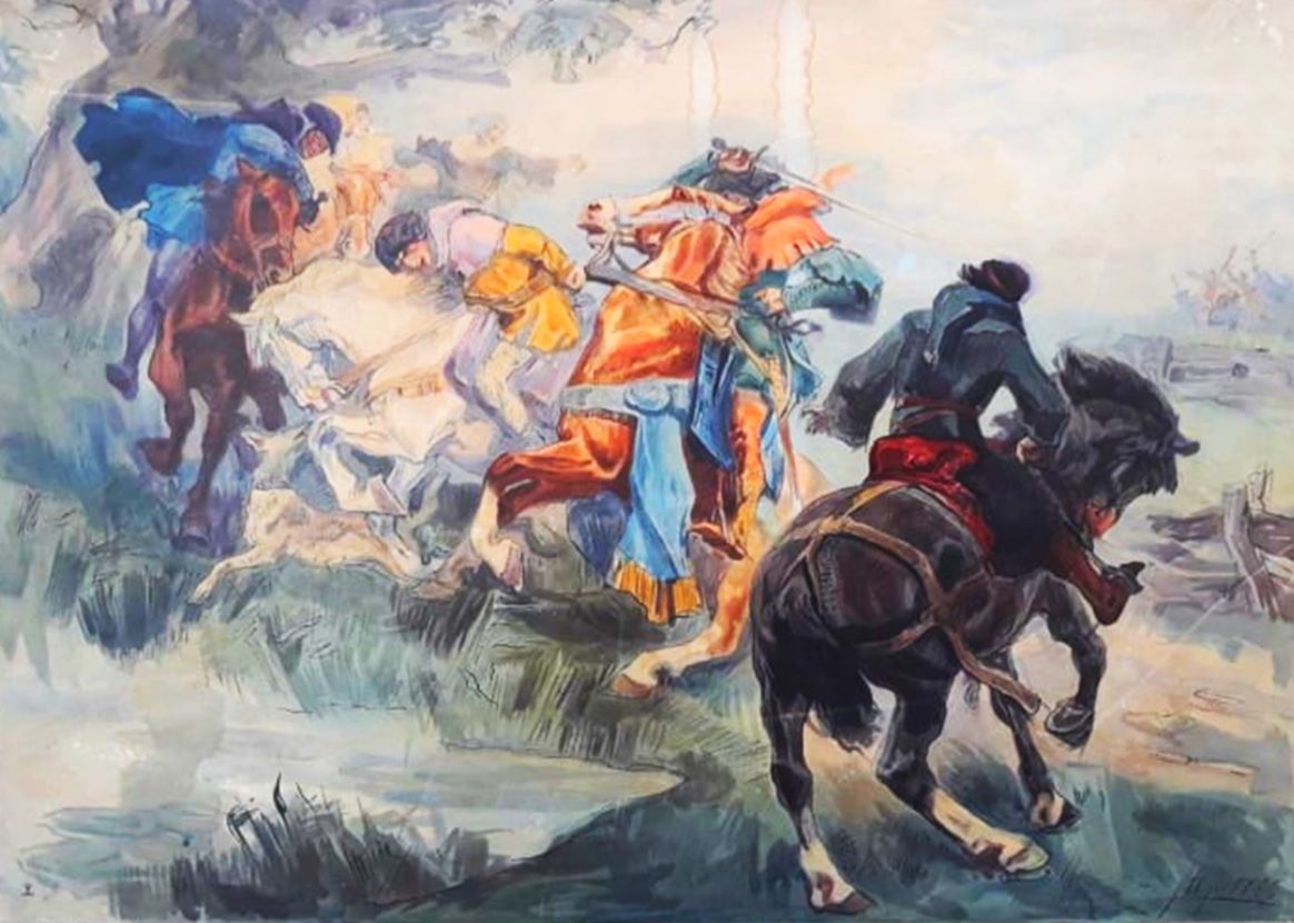 Afbeelding van de ruiterzegel van Floris V met het wapen van het Holland: S'FLORENCII:COMITIS:HOLLANDIE:*. De betreffende zegel hangt aan een oorkonde van 13 oktober 1285. | De moord op Floris V, voorgesteld op een schoolplaat uit 1911 door J.H. Jurres. |