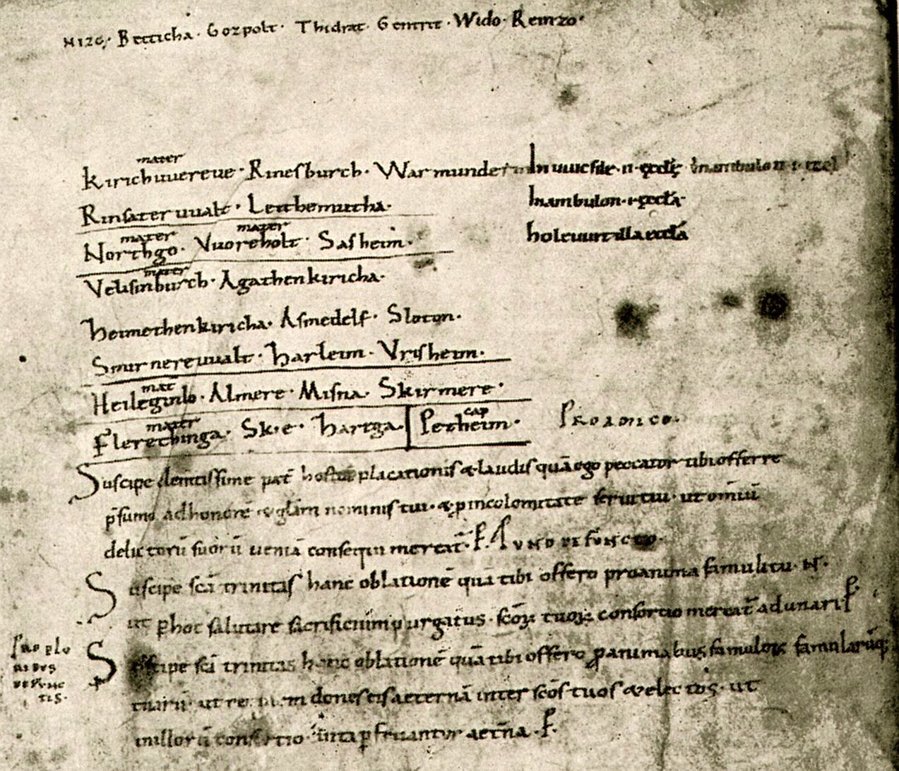 | Een deel van een pagina uit het sacramentarium van Echternach, waarop de oudste originel vermelding van Alkmaar is te zien. Bibliothéque Nationale, Parijs |