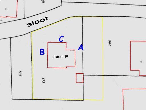 Deze interessante passage deed mij besluiten te onderzoeken om welk huis het hier gaat. Al snel werd duidelijk dat het hier het in 1980 gebouwde huis van de familie Co Laan aan de Goorn 10 betreft (Wester-Koggenland, sectie AD nr. 473). Toeval of niet, het huis is gebouwd op het land 'Het Slotje' (ten zuiden van het perceel is een strook land toegevoegd en een deel van het oude Slotje behoord thans tot de buren ten noorden). Van resten van het kasteel tijdens de bouw in 1980 wist de familie niet af maar op de dag dat ik telefonisch contact opnam was de heer des huizes juist op resten gestuit tijdens het plaatsen van een nieuw hekwerk. Op circa 1 meter diepte bevind zich een laag moeilijk te doordringen puin van rode baksteen. Ook op het gehele erf, aan de oppervlakte, zijn veel resten van puin, mortel en aardewerk te vinden. Zeer vriendelijk werd ik door de familie ontvangen en heb tijdens het bezoek een en ander aan archeologisch materiaal bijeen gezocht. Op bijgaand kaartje (in geel aangegeven het oude perceel 'Het Slotje') heb ik de verdachte boring van de heer Co Laan aan gegeven (A).