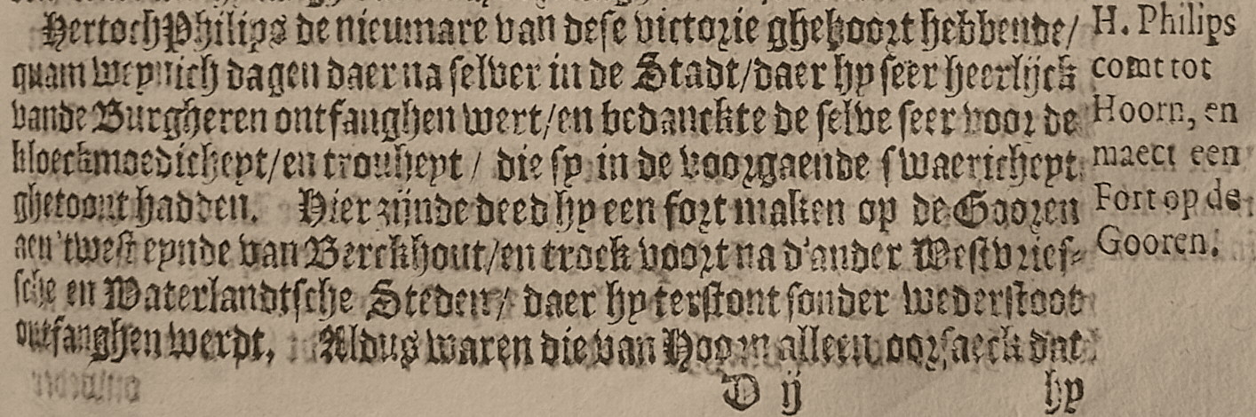In de Hoornse kroniek van Velius8, verschenen in 1604, vonden we kort geleden een opmerkelijke vermelding met betrekking tot het bovengenoemde verhaal. Velius weet namelijk te melden dat hertog Filips van Bourgondië in 1426 opdracht gaf tot het bouwen van een kasteel in de Goorn, in het westeinde van Berkhout.