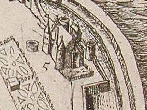 'Buitenpoort van het kasteel Radbout te Medemblik fecit fa. A. Voskuil 1851'. Waar Voskuil zijn bron vandaan had, is niet bekend. De maker is wel bekend, zoals blijkt uit stadsrekeningen van de stad Medemblik, dat was de steenhouwer Hans Kronenburch (credits: Peter Swart van het Westfries Archief). Zeker is in ieder geval wel, dat de poort na 1856 niet meer bestond. Er bestaat nog een tekening uit 1834, waarop de poort nog zichtbaar is, zie: Verder verval in de 19deeeuw gestopt. Een omvangrijke restauratie. Bovenaan de poort bevinden zich drie wapens, links van de stad Hoorn, midden van Medemblik en rechts van Enkhuizen. De redenen voor het plaatsen van juist deze drie wapens is niet bekend. Klik hier of op de afbeelding voor een vergroting. (Deze prent is voor deze website ter beschikking gesteld door de Carolien van Berge, voormalige conservator van Kasteel Radboud) | Een uitvergrote uitsnede van een kaart van de stad Medemblik uit 1649 van Johannes Blaeu, waarop het ontmantelde kasteel is te zien. (Bron: Kaartencollectie van de Bibliotheek van de Universiteit van Amsterdam) | Uitsnede van een kaart van M.Z. van Boxhorn uit 1632 (Collectie Zuiderzee Museum, Enkhuizen). Hierop is duidelijk te zien dat de zuidelijke muur van het kasteel is verwijderd. |