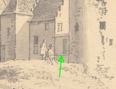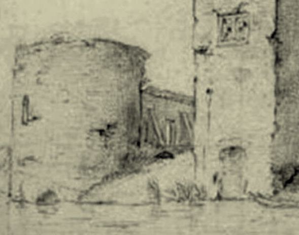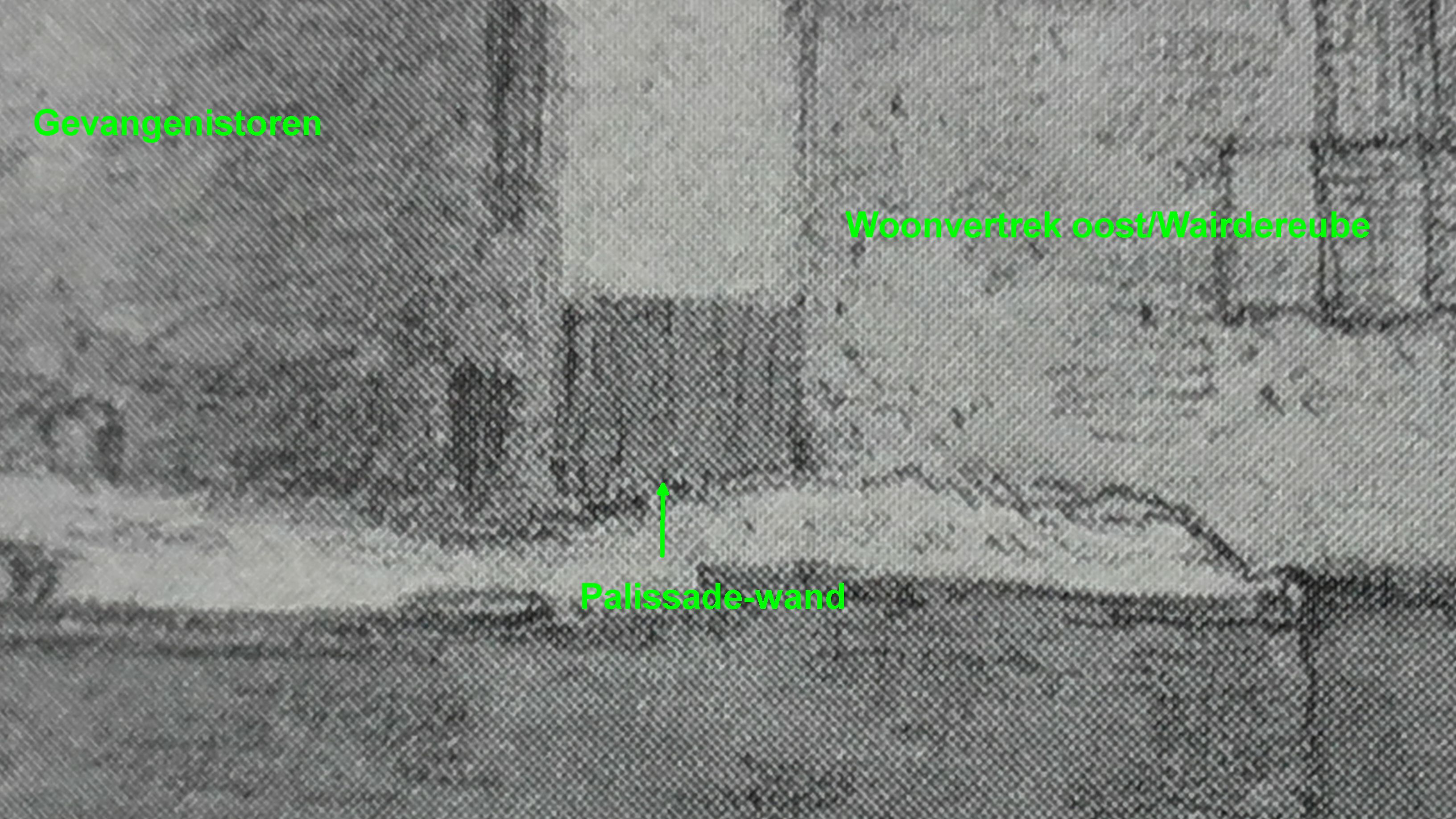 | Detail van de tekening van Roelant Roghman (1647). Palissadewand, gezien vanuit de zuidzijde van het kasteel. (Ontleend aan: H.W.M. van der Wyck: De kasteeltekeningen van Roelant Roghman 1, nr. 120) |