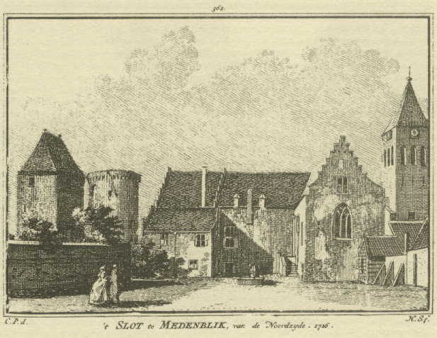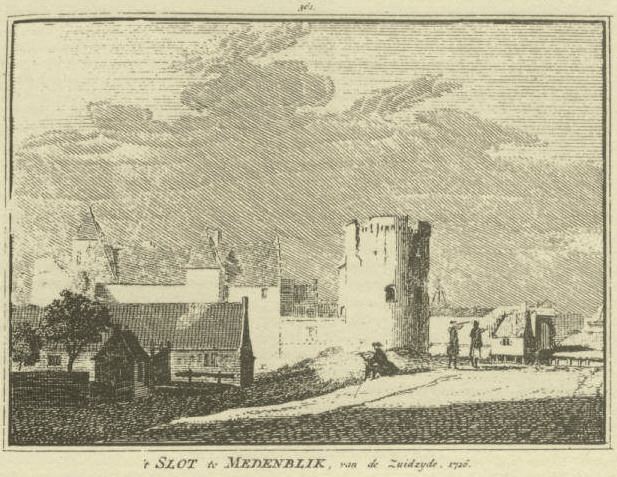 | Hendrik Spilman (1721-1784) naar Cornelis Pronk (1691-1759): 't SLOT te MEDENBLIK, van de Zuidzyde 1726). (Afbeeldingen 1,2 en 3: Uit Verheerljkt Nederland of Kabinet van hedendaagsche gezigten (1745-1774). Facsimile 1964. Europese Bibliotheek, Zaltbommel). |