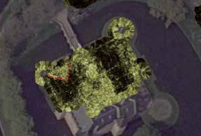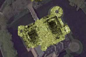 | Grondradar-data van het slotplein. Opvallend zijn de rechthoekige structuren binnen de omtrek van de huidige bestrating die de vermeende verdwenen schildmuren markeren. Rechts hetzelfde, maar dan op een dieper niveau. Foto's © Saricon b.v. en Nancy de Jong-Lambregts. | |