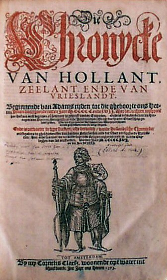 Het titelblad van een van de uitgaven van de Divisiekroniek of Cronycke van Hollant Zeelant ende Vrieslandt met de beeltenis van Floris V, van Cornelis Aurelius. |