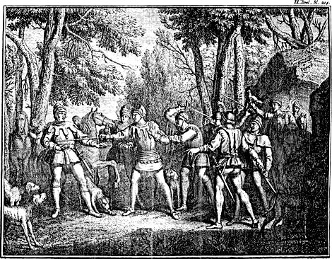 Uit: J. Wagenaar, Vaderlandsche Historie (1749). Afbeelding van L.F. du Bourg en J. Folkema: De Friesche Edelman GALAMA verdedigt zijn Regt tegen Graave FLORIS den II. met het Zwaard. |