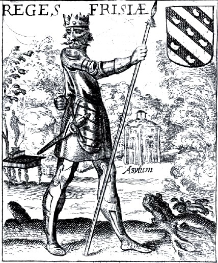 Fantasieafbeelding van Koning Rigold van Friesland. Ontleend aan Hamconius 'Frisia' (1620). De afbeelding toont het Asylum, dat blijkbaar in AD 409 zou zijn neergezet. Gravure van Pieter Feddes van Harlingen. |