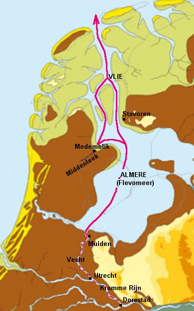 De handelsroute Dorestad-Friesland omtrent 800. (Bron: Wikimedia Commons. Palaeography of the Netherlands 800 AD, RACM & TNO. Bewerking: Ben Dijkhuis.) |