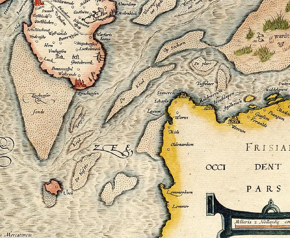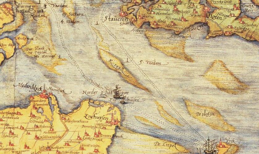 Een kaartfragment van de kaart door Christian Sgrooten (noord is boven) uit de Atlas Bruxellensis uit 1573 van Holland, Waterland en een deel van Friesland. |