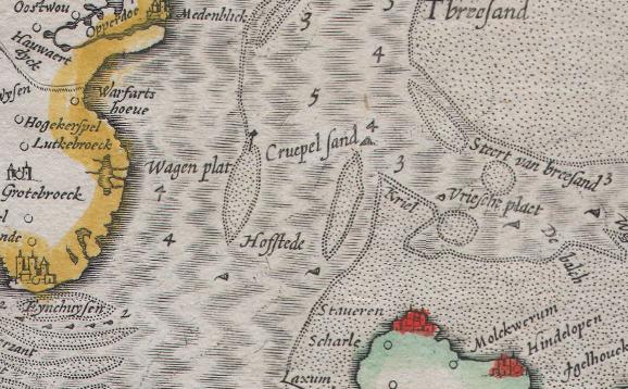 We zien op de bovenstaande kaarten inderdaad de zandplaten 'De Crepel' en 'Cruepel Sand', Crepelsand, alhoewel de locaties ervan nogal variëren. Daarnaast zien we in de buurt daarvan steeds een zandplaat met de opvallende naam 'Hofste' of 'Hofstede'.