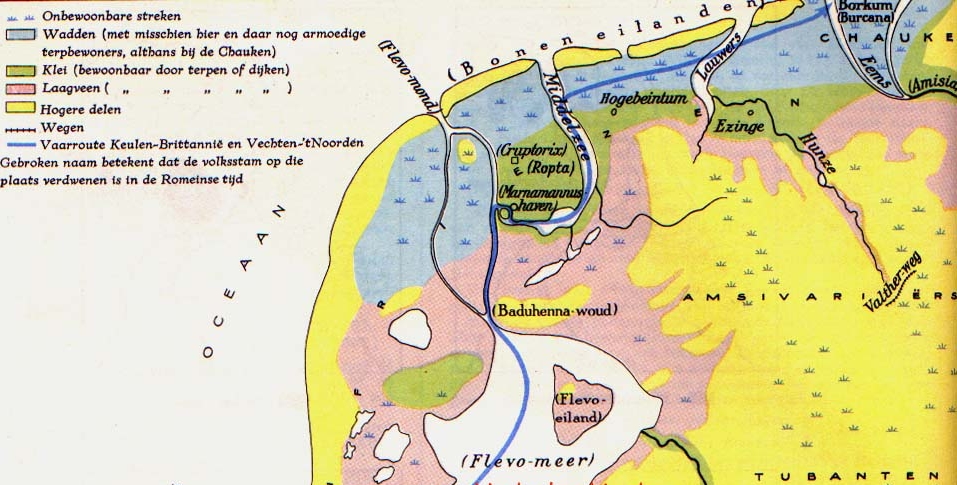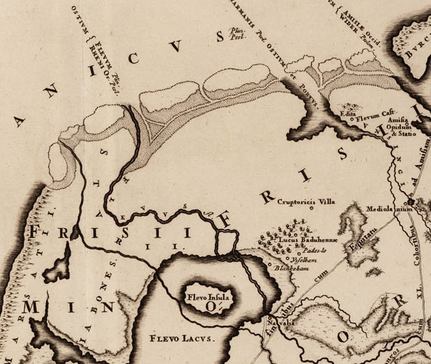 Fantasiereconstructie van Friesland ten tijde van de Romeinen, door Menso Alting (1541-1612). Gedrukt in Leeuwarden door François Halma, 1718. Objecten: Lucus Baduhennae, Cruptoricis Villa (Villa Cruptorix), Flevum Castello. |