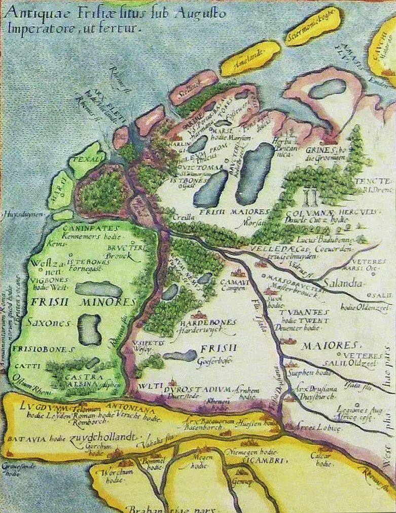 Fantasiereconstructie van Friesland (Frisii Minores en Frissii Majores) ten tijde van het Romeinse Rijk, door Abraham Ortelius (1527-1598), naar Joachim Hoppers. Uitsnede van Frisia Occidentalis uit Theatrum Orbis (Antwerpen, 1595). Objecten: Lucus Baduhennae (Woud van Baduhenna), Creilla (Creil). |