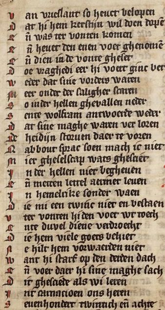 153 Van vrieslant so heuet belopen Dat hi hem kerstijn wil doen dopen 155 Ende was ter vonten komen Ende heuet den enen voet ghenomen Ende dien inde vonte gheset Doe vraghedi eer hi voert ginc bet Weder dat sine vorders waren 160 Meer onder der saligher scaren So inder hellen ghevallen neder Sente wolfram antwoerde weder Dat sine maghe waren ver loren De heidijn storuen daer te voren 165 Rabbout sprac soen mach ic niet Mier gheselscap wats ghesciet Jn der hellen niet begheuen Ende metten lettel aermer leuen Jn hemelrike sonder waen 170 Die mi een twinc niet en bestaen Vter vonten hi den voet wt toech Ente duvel diene verdroech Die hem viele goets behiet Ne hilt hem vorwaerden niet 175 Want hi starf op den derden dach Ende voer daer hi sine maghe sach Dit ghesciede als wi leren Jnt carnacioen ons heren Seuenhondert twintich ende achte |