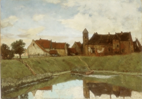 De zuidzijde van het kasteel rond 1880, een schilderij van Nicolaas Bastert (1854 - 1939). De context met betrekking tot de omgeving is hier prachtig uitgewerkt. Met vriendelijke permissie van het Stedelijk Museum in Amsterdam (A2183) voor het ter beschikking stellen. Voor een meer gedetailleerde vergroting in zwart-wit kunt u terecht op de website van het Geheugen van Nederland. |