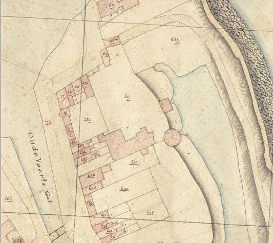 Fragment uit de kadastrale kaart van ca. 1825 van Medemblik, met het kasteel. Aan de oostkant (rechts), de grachtzijde, ziet men helemaal bovenin de intekening van de in 1857 gesloopte Oosterpoort, alsmede de daarbij gesloopte restanten van de vierkante en ronde toren, die in de oude stadswal waren geïntergreerd. Eveneens zien we dat in ca. 1825 de zuidwestelijke toren reeds verwijderd was. Bron: Beeldcollectie van de Rijksdienst voor het Cultureel Erfgoed (RCE): Kadastrale kaarten. |