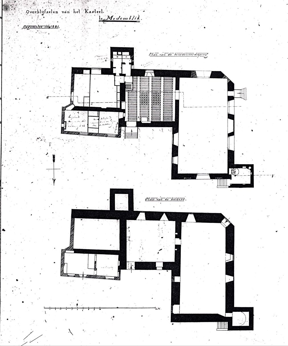 De onderstaande tekening van het souterrain ('Plan van de kelders') en de begane grond ('Plan van de bovenverdieping'), met als titel 'Overblijfselen van het Kasteel te Medemblik. Opgemeten in 1881' toont een aantal aangebrachte kenmerken. Dit zijn jongere muurconstructies die gearceerd zijn aangegeven. In de zuidelijke toren bevinden zich toiletten. Men ziet diverse betimmeringen van kasten(?) en voor het opdelen van de verschillende kamers. In de kamer naast de grote zaal (burchtzaal) is het cassettenplafond aangegeven, evenals een trapportaal. In de tekening zijn verder drie ingangen naar de 'begane grond' aangegeven: aan de westelijke toren, de westelijke en aan de noordelijke muur. Er zijn slechts twee toegangen aan de buitenkant van het gebouw naar de kelderruimten. Tussen het westelijk en oostelijk deel van het 'Plan van de kelders' blijkt geen doorloop te zijn, dit duidt op een scheiding van twee delen van het souterrain. Wellicht waren zij vanuit de verdieping erboven bereikbaar. Verder zijn, inzake het 'Plan van de bovenverdieping' de volgende opmerkingen met potlood bijgeschreven: