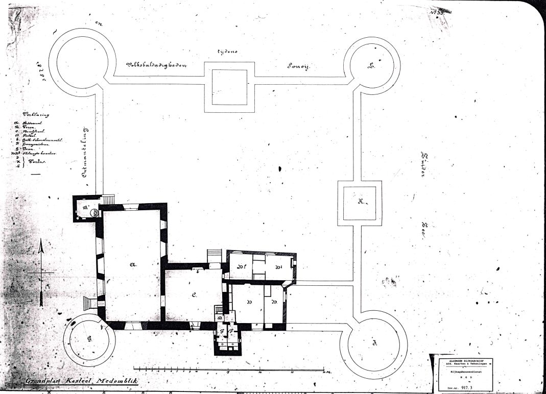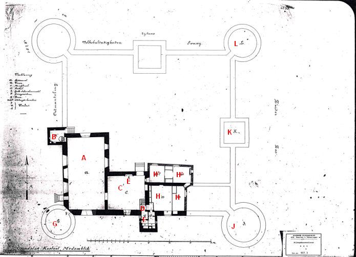 Tekening van de opmeting uit 1881: Grondplan van het Kasteel Medemblik. De rode letters zijn ter verduidelijking door de auteur (BGD) toegevoegd. (Nationaal Archief, Archief Rijksgebouwendienst, 917.3) Klik hier voor een grotere afbeelding. |