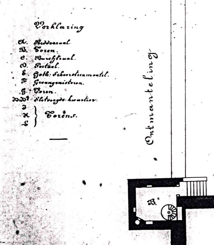 - J, K en L: Toren en -restanten, niet meer bestaand sinds 1857