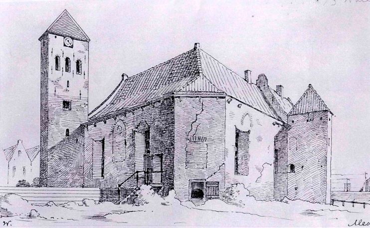 Tekening uit ca. 1890 vanuit het zuidwesten. Op voorgrond de hoek waar zich de zuidwestelijke toren bevond. De sporen van de oude boogvensters van uit de tijd dat het slot als kerk werd gebruikt zijn hier duidelijk zichtbaar. (A. Weissmann, 1858-1923). |