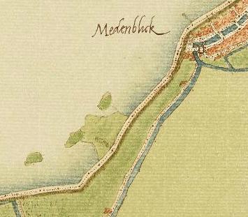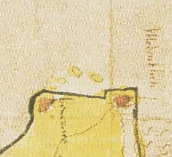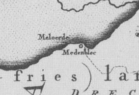 Een fragment uit een gefantaseerde 'gereconstrueerde' kaart van Menso Alting uit 1710, waarop Meloerde staat aangegeven. (Lit. 15) |