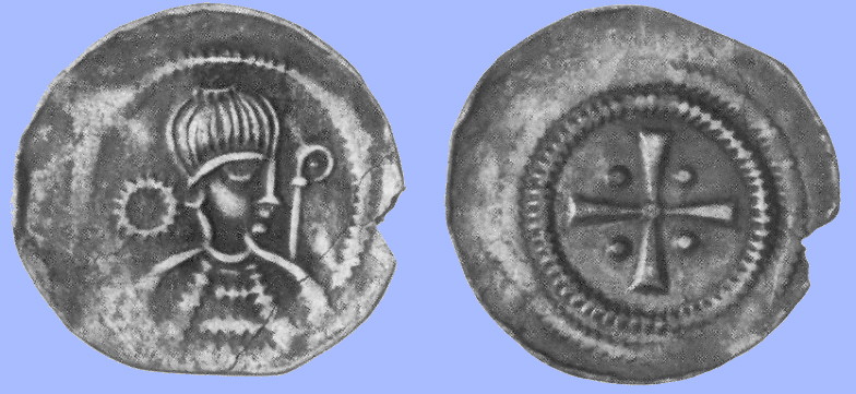 Een anonieme zilveren penning of denier uit de 12de eeuw. Dit is één van de 1200 munten die in 1892 zijn gevonden in de terp Avendorp te Schagen. De munt toont een kop van een bisschop. De muntjes zijn mogelijk in West-Friesland vervaardigd, daarbij is het niet uitgesloten dat ze in Medemblik zijn geslagen.