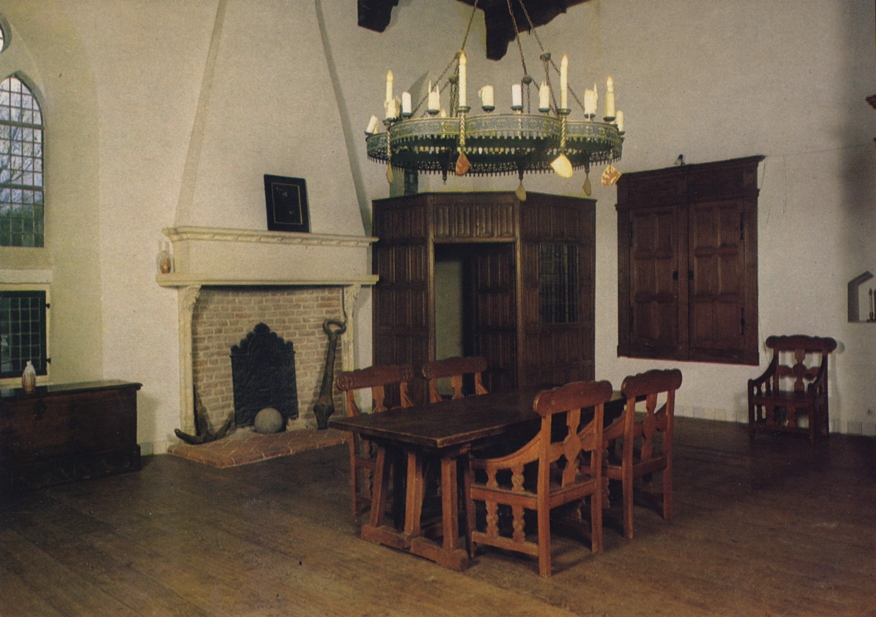 | Het Nieuwe Altaar in context. Deze afbeelding is van een prentbriefkaart uit ca. 1970(?). Het voormalige altaar bevindt zich, rechts op de foto, achter de houten luiken aan de muur. Verder bevinden zich opvallende voorwerpen voor de haard, waaronder een anker en kanonskogel. (Beeldcitaat: Anonieme foto). Klik hier voor een grotere afbeelding. |