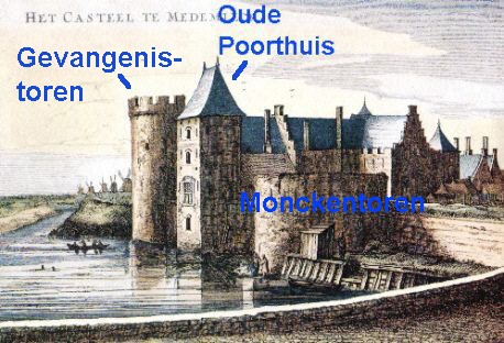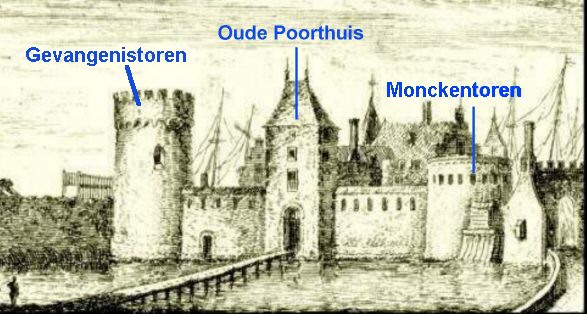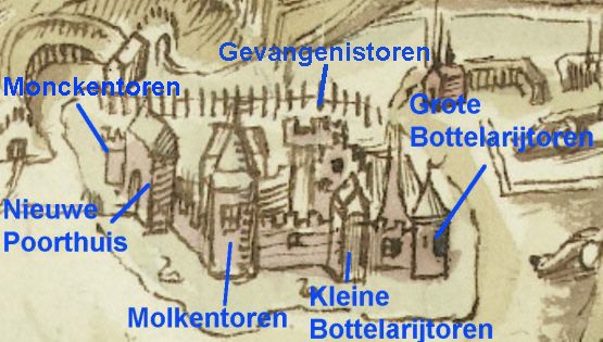 Aanvankelijk hebben de auteurs zich laten (mis)leiden door het feit, dat in de huidige situatie de zuidelijke vierkante toren met gevangenistoren aangeduid kan worden, vanwege de aanwezigheid van een klein cachot. Er zijn duidelijk aanwijzingen dat de laatste echter van een veel latere datum is. Uit het manuscript valt af te leiden, dat in de 14de eeuw de Gevangen Toren de hoge zuid-oostelijke hoektoren was, zoals in het onderstaande blijkt: