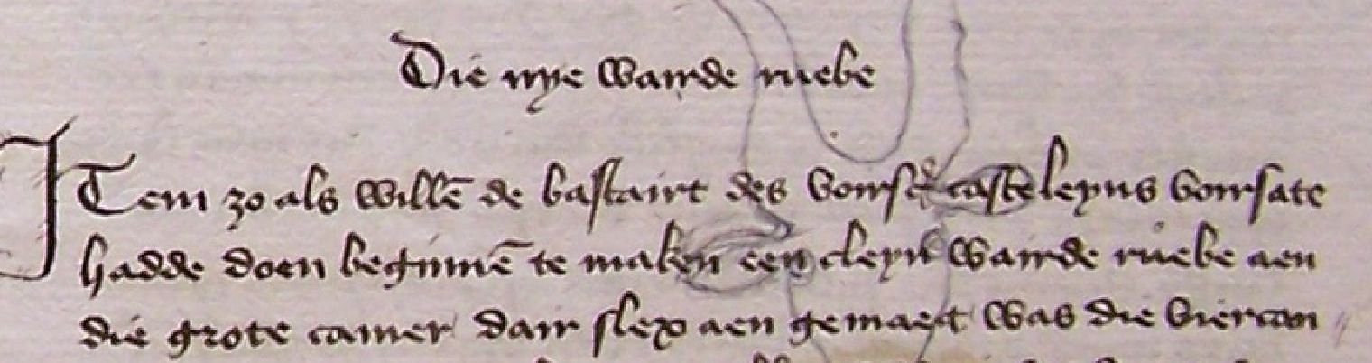De Warde Reube, nr. 12, was de garderobe (denk aan het Engelse woord: wardrobe) of kledingopslag. Dit was een nieuwe uitbouw van de Grote Kamer, nr. 11. De voormalige kastelein, Willem de Bastaard van Beieren, begon met de bouw van een kleine 'Warde Reube'. Dit was een uitbouwtje van de Grote Kamer, nr. 10 in de vorm van een vierkante muur met een klein geveltje. Het geveltje was echter ingestort en de nieuwe kastelein deed dat weer opmetselen en 'beschieten met wagenschot'. Vervolgens liet hij er een kleine schoorsteen in maken en met houten planken vloeren. Het geheel deed hij bedekken met een leien dak. Niet geheel duidelijk spreekt men nog van een 'valdeur', een nieuw te plaatsen 'nierdeur' beneden en het geheel te doen beschieten en uiteindelijk te voorzien van glasvensters.
