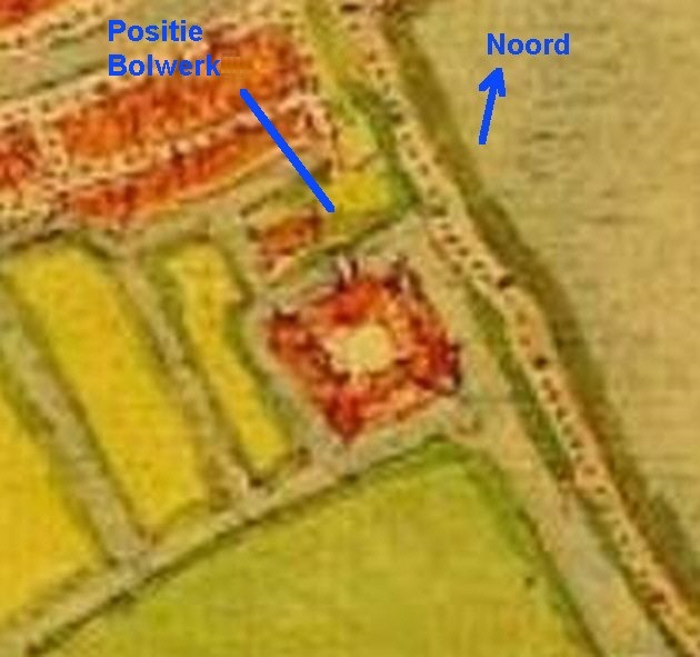 | Een fragment van de kaart van Medemblik van Jacob van Deventer uit ca. 1560. De Nieuwe Haven (de huidige Oosterhaven) is nog niet aangelegd en ten noorden van het kasteel bevindt zich een eiland, dat via een brug met het kasteel in verbinding staat. Men kan er vanuit gaan, dat dit de plaats van het 'Bolwerk' of voorburcht was. |