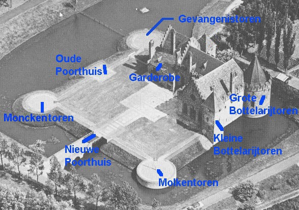 | (Nieuwe) Altaar Bakkerij Beschoeiing van de gracht Bestrating Blauwe Kamer Boerderij Bolwerk (Grote) Bottelarij (Kleine) Bottelarij Bottelarijbrug Bottelarijkelder (Grote) Bottelarijtoren (Kleine) Bottelarijtoren (Nieuwe) (Kleine) Garderobe Gevangenis Gevangenistoren Gracht Hemelrijk (zolder) (Klein) Hemelrijk Hooiberg (Grote) Kamer (Klein) Kamertje Kamer boven het Oude Poorthuis (Nieuwe) Keuken Kippenhok, Hoenderhuis Koeienstal Maagden- of meidenkamer Molkentoren Monnikentoren Ossenstal Paardenstal Poort (Nieuwe) Poorthuis met de korenzolder (Oude) Poorthuis Portiershuisje Put Put in het Bolwerk Secretarie/Comptoire Singel Slaapkamer Voorraadkamer of -kast Valbrug Varkenskot Veulenhok Voorpoort Waterpoort met de brug Wapenbord Washuisje Zaal |