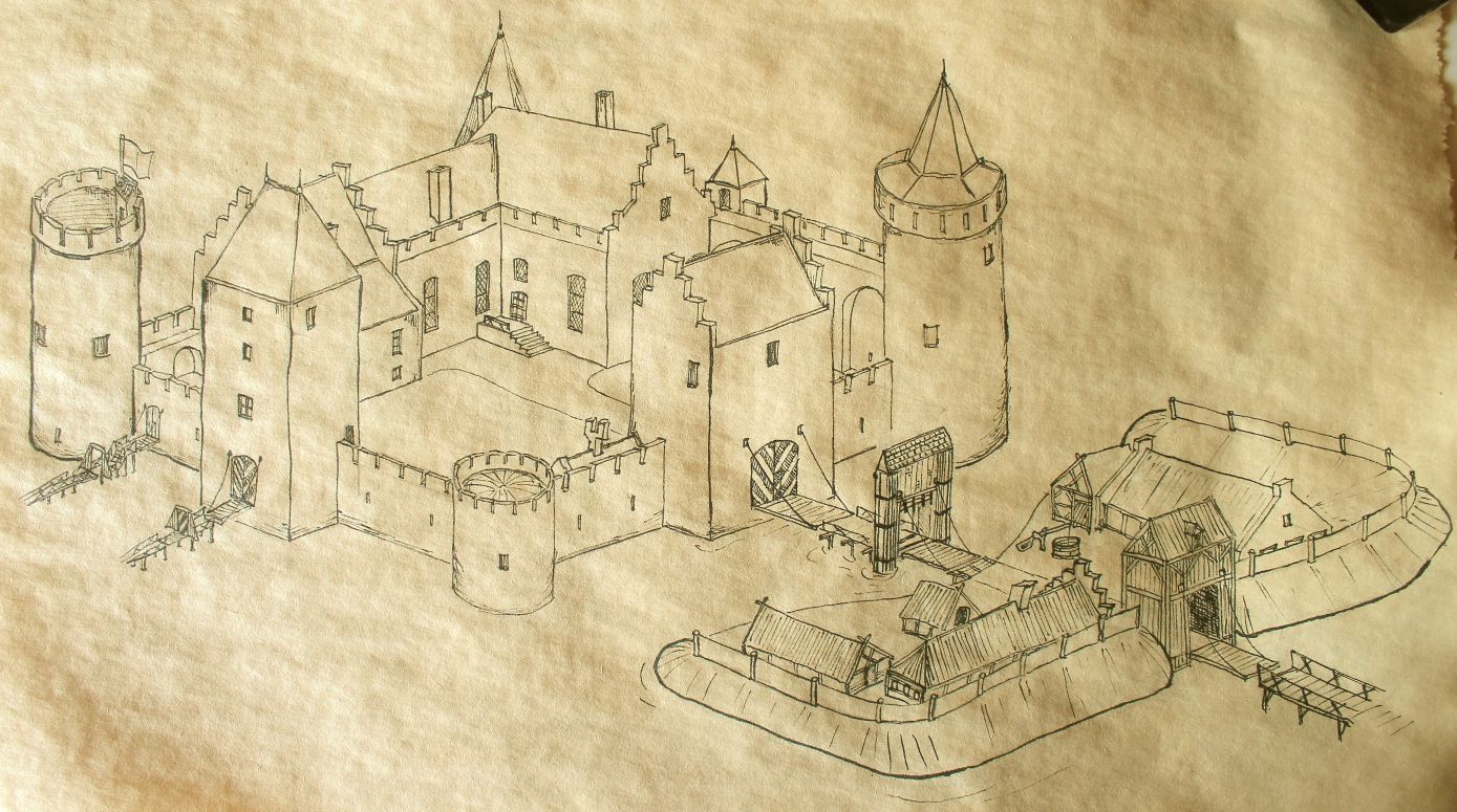 | Een artist's impression door Marius Bruyn van het 15e eeuwse kasteel, mede geïnspireerd op 'Tymmerage'. |