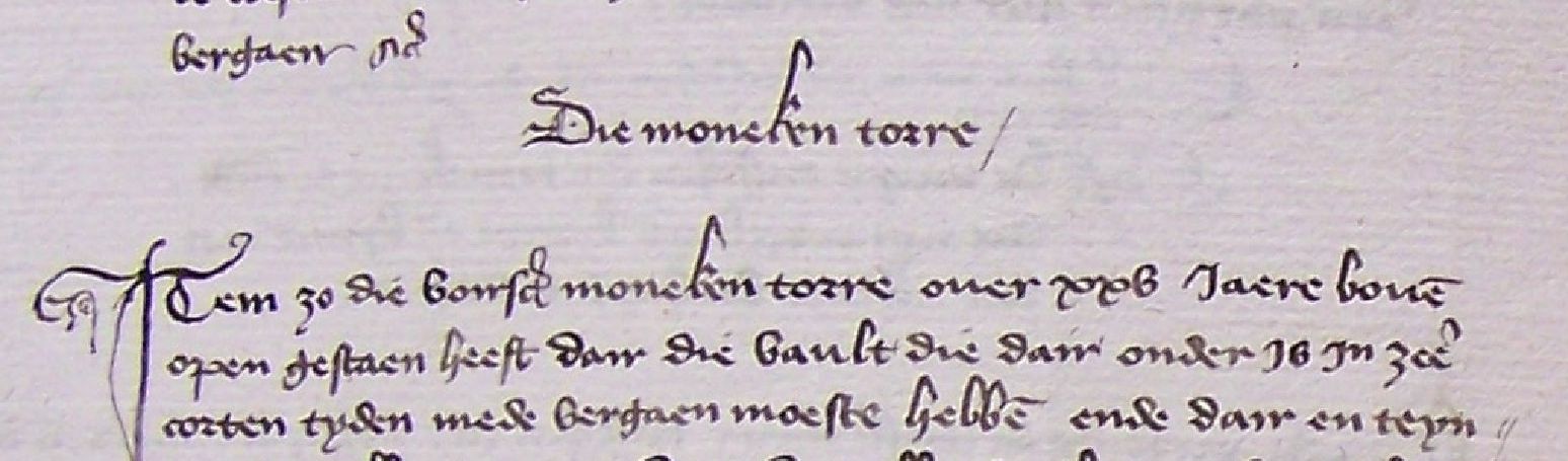 Nr. 5. Deze was gesitueerd aan de muur, die in de richting van de Nieuwe Poort liep. Aan de binnenzijde van die muur, stond het Bakhuis (bakkerij). De Monckentoren was in ieder geval reeds in 1418 niet meer voorzien van een dak, waardoor de 'vault' (gewelf, vergelijk het Engelse woord 'vault') was vergaan. Tevens was het aangrenzende slot hierdoor aangetast. Opvallend is de opmerking dat de Monnikentoren, ondanks zijn geringere hoogte de 'sterkste' toren van het slot was. De kastelein heeft de toren doen verwelven met een stenen gewelf en een nieuwe trap laten maken, zodat men, d.m.v een kleine ladder van buiten op de toren kon klimmen: