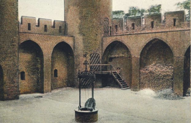 | Het document maakt melding van 'bogen' die opgevuld worden. Deze bogen van de weermuur, die heden ten dage niet meer bij het kasteel van Medemblik te zien, zijn nog wel aanwezig in het Muiderslot, zoals uit deze ingekleurde zwart-wit foto van 1904 blijkt. Het Muiderslot en het kasteel van Medemblik hebben veel stijltechnische overeenkomsten. (Prentbriefkaart uit 1904, Leipzig: uitsnede. Collectie Bernd Ooijevaar) |