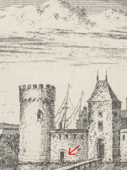 Omdat er oorspronkelijk bij het huis geen poort was, waarmee de kastelein het kasteel onbezorgd kon betreden, heeft hij onderin de boog, die zich onder de trap van de Gevangentoren bevindt, een sterke poort met een valbrug laten maken. Daar is tevens een trap aangelegd die vier-en-een-halve voet neerwaarts gaat. Het verhaal is verder niet helemaal duidelijk, maar hij heeft het geheel laten afsluiten met een goede deur en sloten. Verder was er een loopplank die over de gracht loopt.