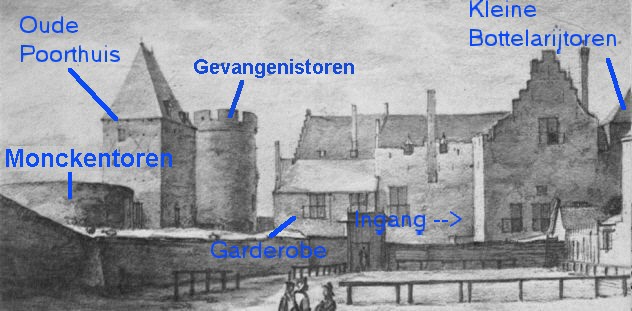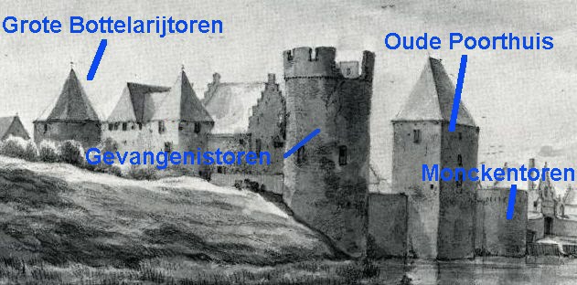 We leren namelijk uit deze beschrijving, dat er muur was, voorzien van bogen, die in de richting van de Gevangentoren liep. Boven één van deze bogen bevond zich een trap naar de Gevangentoren toe. De Gevangentoren kan derhalve, dus onmogelijk de zuidelijke vierkante zijtoren zijn geweest, waar zich nu in het heden, de gevangenis bevindt. Opmetingen uit 1938 door Monumentenzorg laten namelijk zien, dat deze vierkante toren in de 14de eeuw reeds door gebouwen was ingesloten. Namelijk door de kamers, die als de Grote en Blauwe Kamer zijn geïdentificeerd, zodat er geen weermuur (meer) aan kon grenzen. Omdat van de andere torens de naam ondertussen bekend is, kan het niet anders, dan dat de Gevangentoren de hoge zuid-oostelijke hoektoren moet zijn geweest.