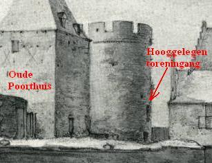 Dan rijst nog slechts de vraag, welke muur naar de Gevangentoren precies werd bedoeld. Was het de zuidmuur tussen het woonvleugel en de Gevangentoren, of was het de oostelijke muur, tussen het Oude Poorthuis en Gevangentoren? Een redelijk gedetailleerde tekening van Roghman uit 1647, geeft wellicht een uitsluitsel. Het zou voor de hand kunnen liggen, dat als een trap naar de Gevangentoren leidt, er eveneens aan het einde van die trap een ingang van toren moet zijn geweest. We herkennen op Roghmans tekening, mogelijkerwijs een ingang aan de westkant van Gevangentoren en niet aan de zuidkant ervan. Als we dus even aannemen, dat deze toreningang reeds in de 14de eeuw bestond, is het veronderstelbaar, dat de muur met bogen, waarin de Waterpoort werd gemaakt, de zuidelijke weermuur was. Overigens zijn er ook prenten bekend, waarin een kleine poortje in de oostelijke weermuur is gesitueerd, in combinatie met een loopbrug vanaf het 'Oude Poorthuis' 3. In dat laatste geval zou de ingang van de toren wellicht via een houten trap en steiger aan de oostmuur bereikbaar zijn geweest.