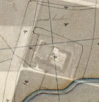 | Een deel van een kadastrale kaart uit 1830, dat transparant over een deel van een luchtfoto is gelegd. De funderingen van het kasteel zijn goed herkenbaar. | Een uitsnede van nevenstaande afbeelding. Iets boven het kasteel is de opmerking 'oud kasteel', in potlood geschreven. (Afbeeldingen: Bernd Ooijevaar). |